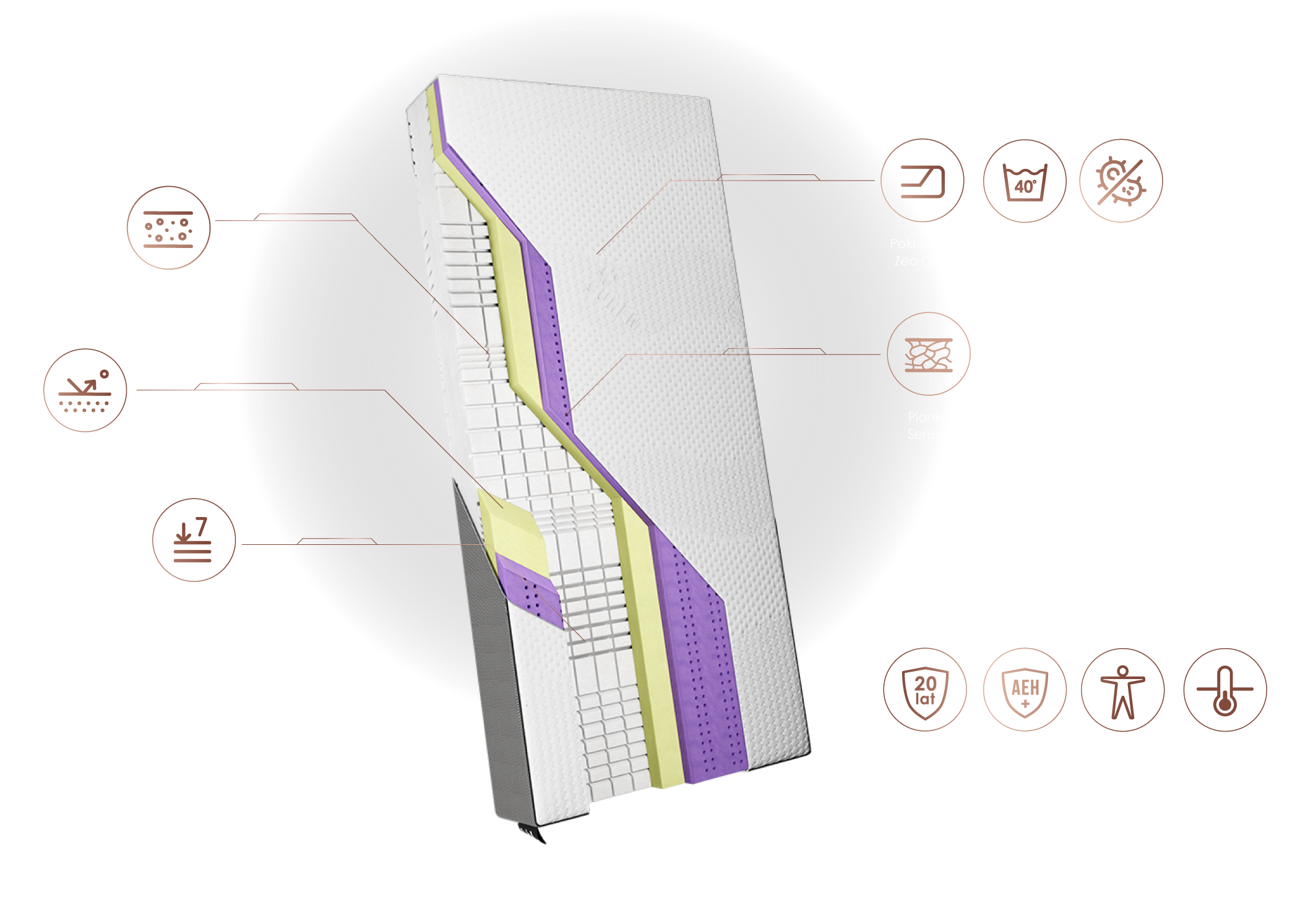Fundament materaca wykonany z hybrydowej pianki o wysokiej gęstości. Specjalne nacięcia konturowe tworzą 7 stref twardości i poprawiają wentylację wewnątrz wkładu.