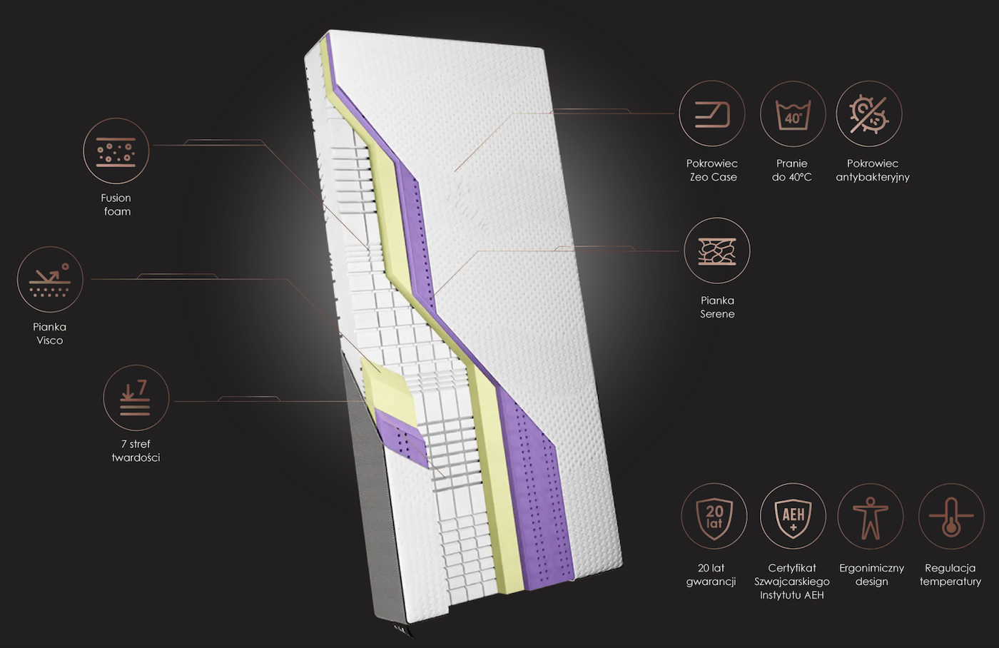 Sekretem tego modelu jest synergia trzech różnorodnych pianek. Każda z nich pełni inną funkcję, tworząc razem idealne środowisko snu o wysokości ok. 26 cm.