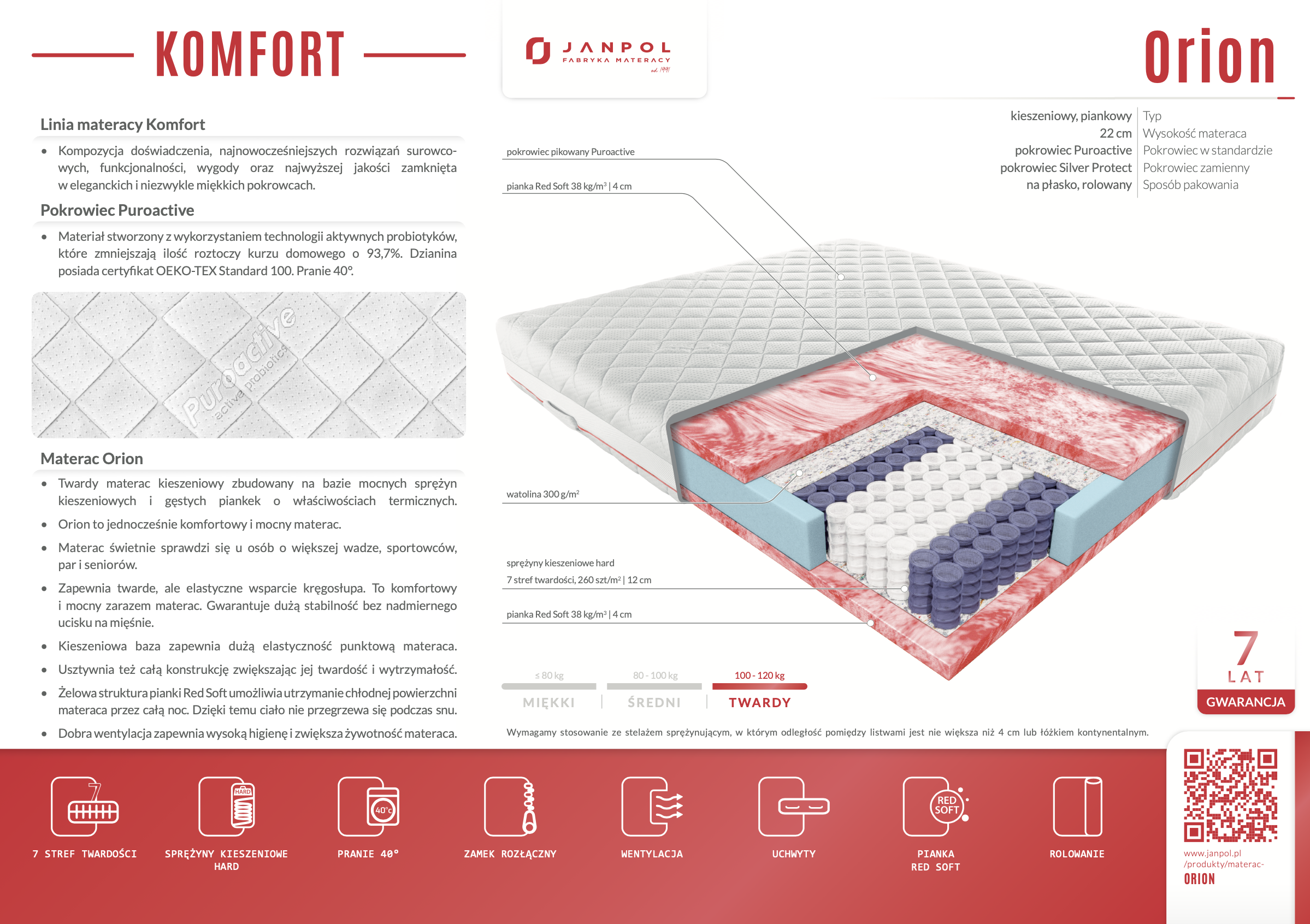 Jakość i wyjątkowa wytrzymałość użytych komponentów pozwala nam objąć materac Orion aż 7-letnią gwarancją producenta.