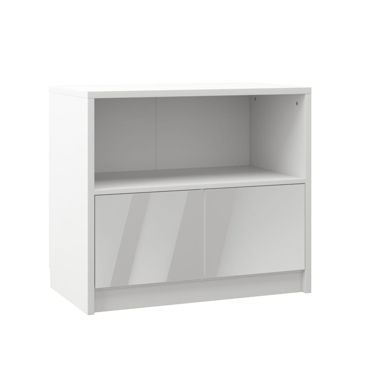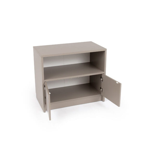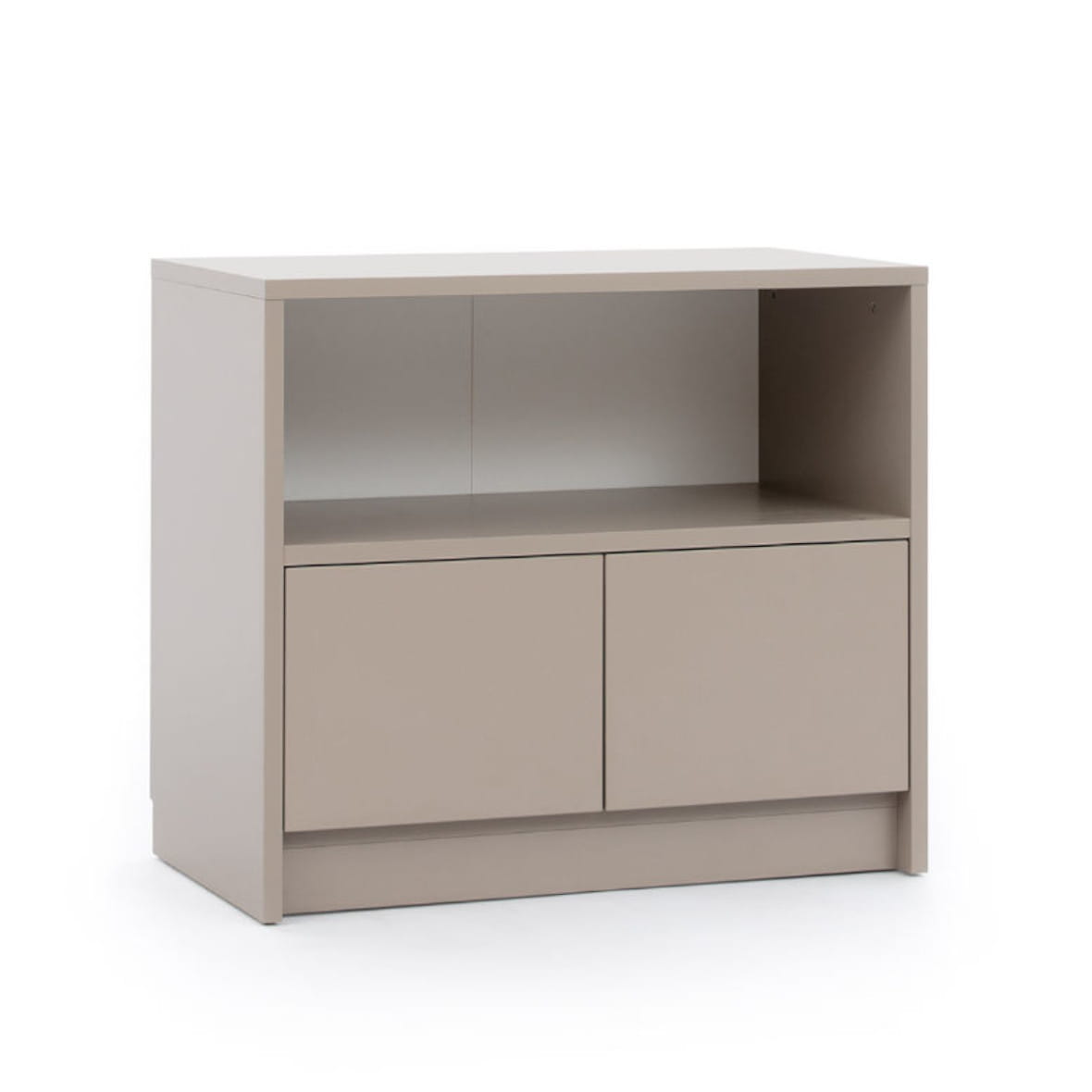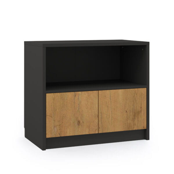 - Praktyczne Rozmieszczenie: Komoda posiada dwoje drzwi, za którymi kryją się przestronne półki, idealne do przechowywania różnych przedmiotów.