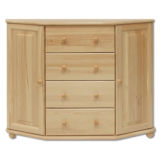 Komoda jest wykonana z litego drewna sosnowego, dzięki czemu jest solidna i trwała. Drewno sosnowe jest również naturalnym materiałem, który nadaje komodzie ciepły i przytulny wygląd.