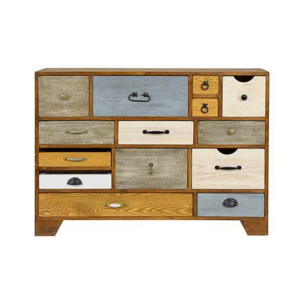 Wykonana z litego drewna sosnowego, komoda KD790 jest trwała i solidna. Jej oryginalny styl rustykalny wyróżnia się różnej wielkości szufladkami wykończonymi w różnych kolorach z różnymi uchwytami. To połączenie tworzy niepowtarzalną kompozycję, która przyciąga wzrok i wprowadza do każdego wnętrza wiosenny powiew świeżości.