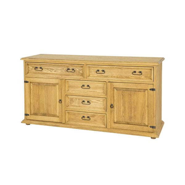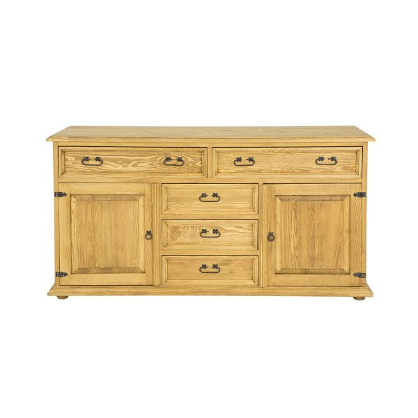 Wykonana z litego drewna sosnowego, komoda KD807 jest trwała i solidna. Jej rustykalny styl dopełniają ręcznie wykonane metalowe uchwyty i zawiasy z efektem postarzenia, tworząc spójny i harmonijny design.