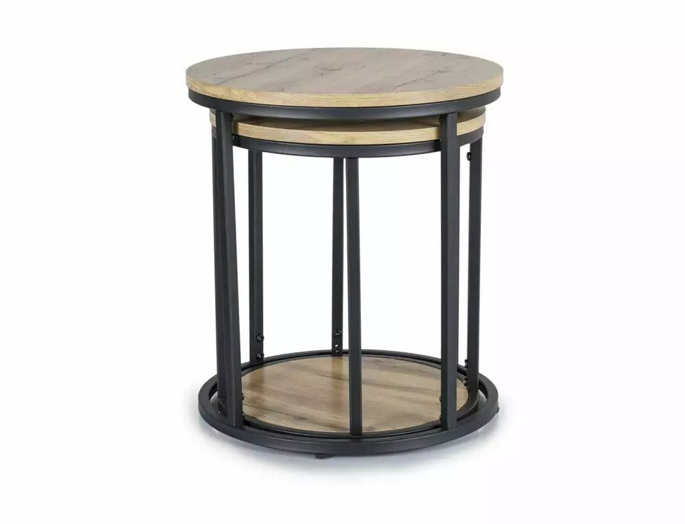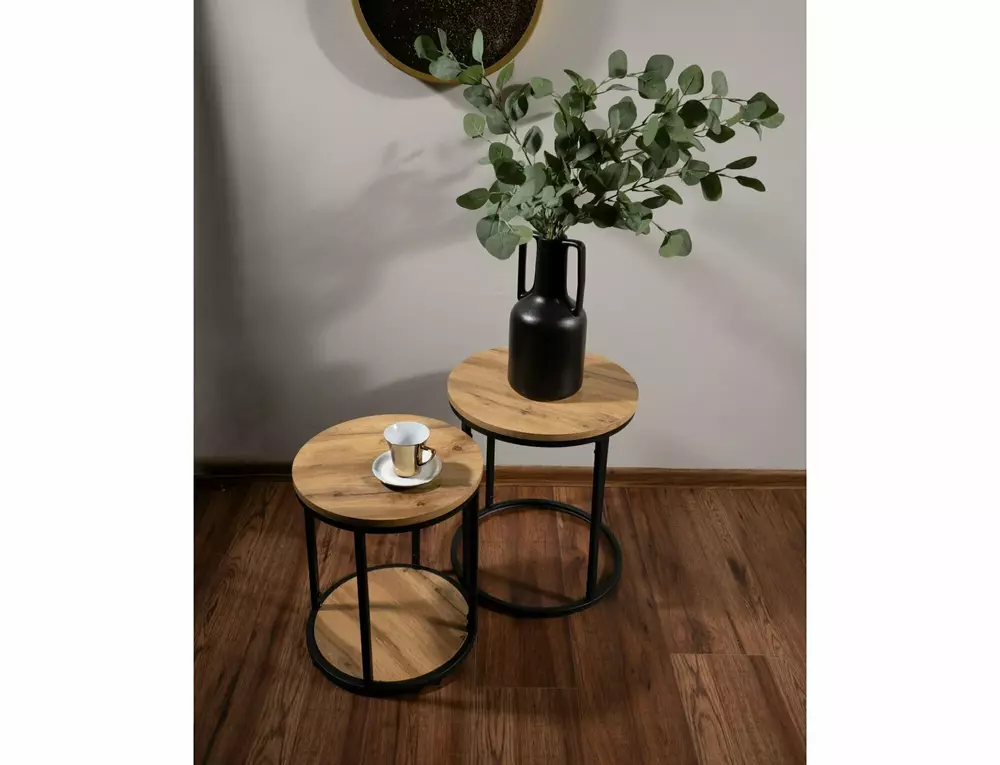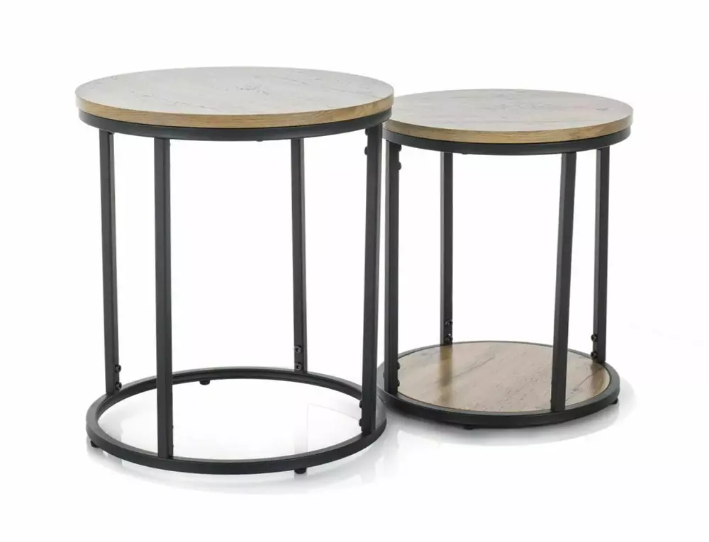 Ława Into to stylowy zestaw dwóch ław, które łączą nowoczesny design z funkcjonalnością. Blat wykonany z MDF z okleiną w kolorze dąb artisan dodaje ciepła i naturalnego charakteru wnętrzu, a solidny metalowy stelaż w kolorze czarnym zapewnia trwałość i stabilność. Dzięki kompaktowym rozmiarom, ławy można dowolnie aranżować, co czyni je praktycznym rozwiązaniem do każdego salonu.