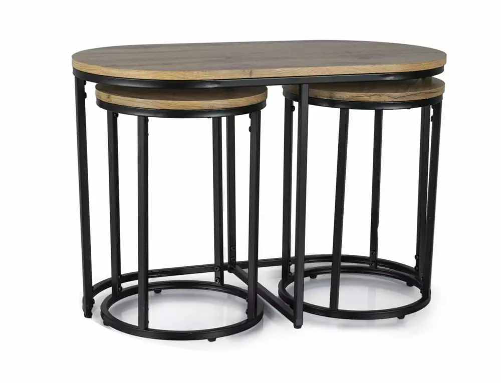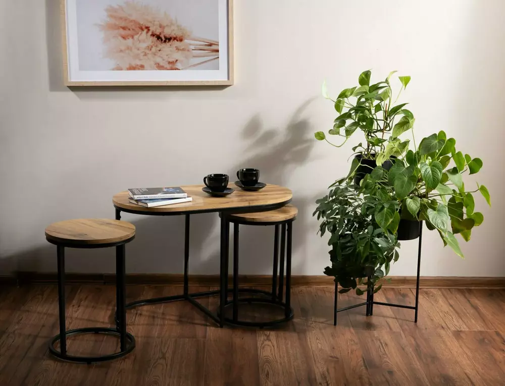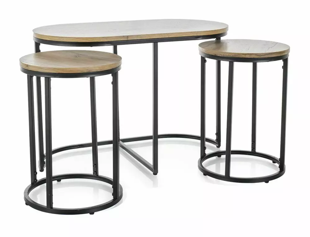Ława Twix to elegancki zestaw ław, który łączy nowoczesny design z funkcjonalnością. Blat wykonany z MDF pokrytego okleiną w kolorach dąb artisan lub orzech vintage nadaje ciepłego i naturalnego charakteru, a metalowy stelaż zapewnia stabilność oraz trwałość. Dzięki zestawowi mniejszych, okrągłych ław, Twix oferuje wszechstronne możliwości aranżacyjne, idealne do każdego salonu.