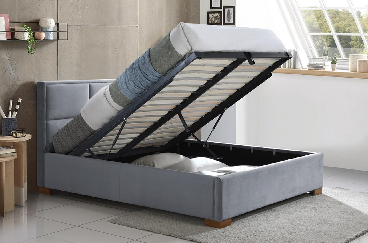 Łóżko zostało wyposażone w praktyczny pojemnik na pościel z płyty MDF, pokrytej estetyczną czarną włókniną. Dzięki zastosowaniu gazowych siłowników, otwieranie i zamykanie pojemnika staje się łatwe i wygodne. To doskonałe rozwiązanie, które pozwala utrzymać porządek w sypialni.
