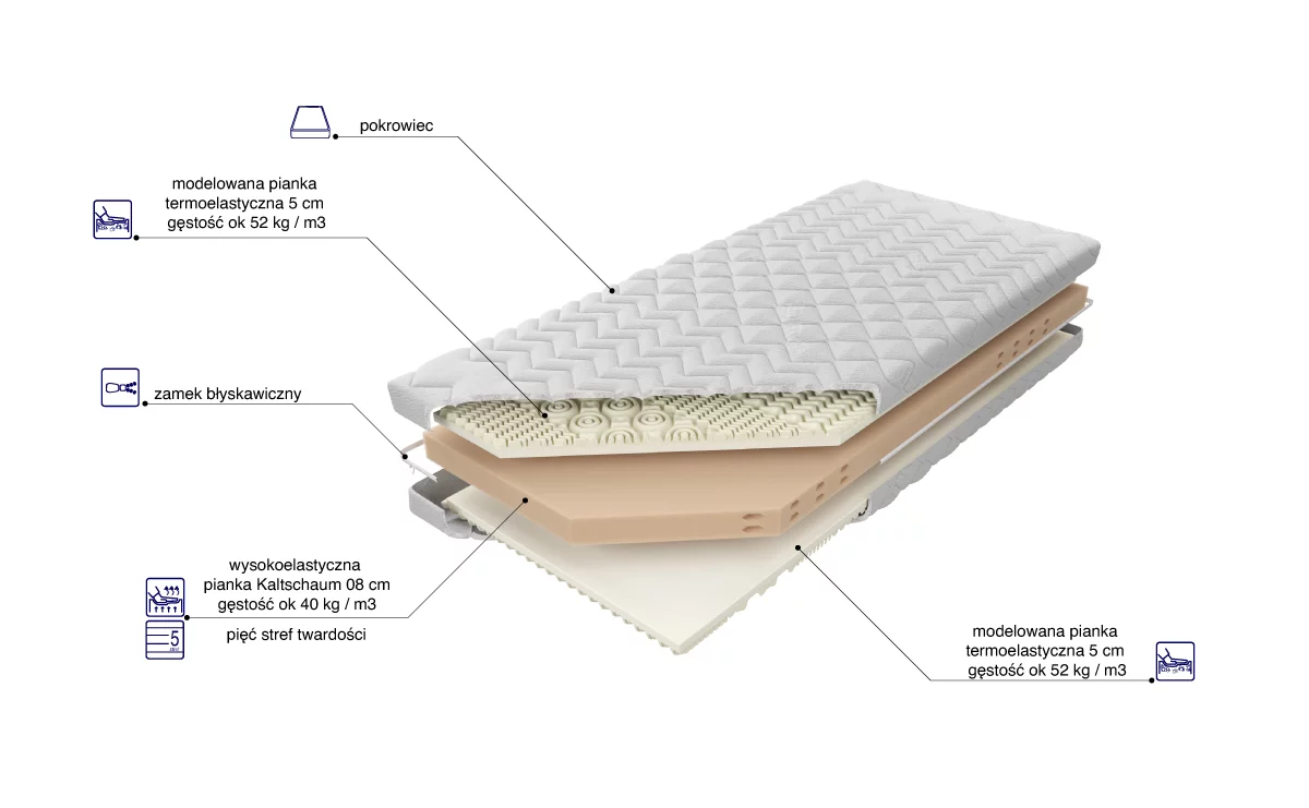 - Typ: Materac piankowy, 3-warstwowy, 5-strefowy, dwustronny.