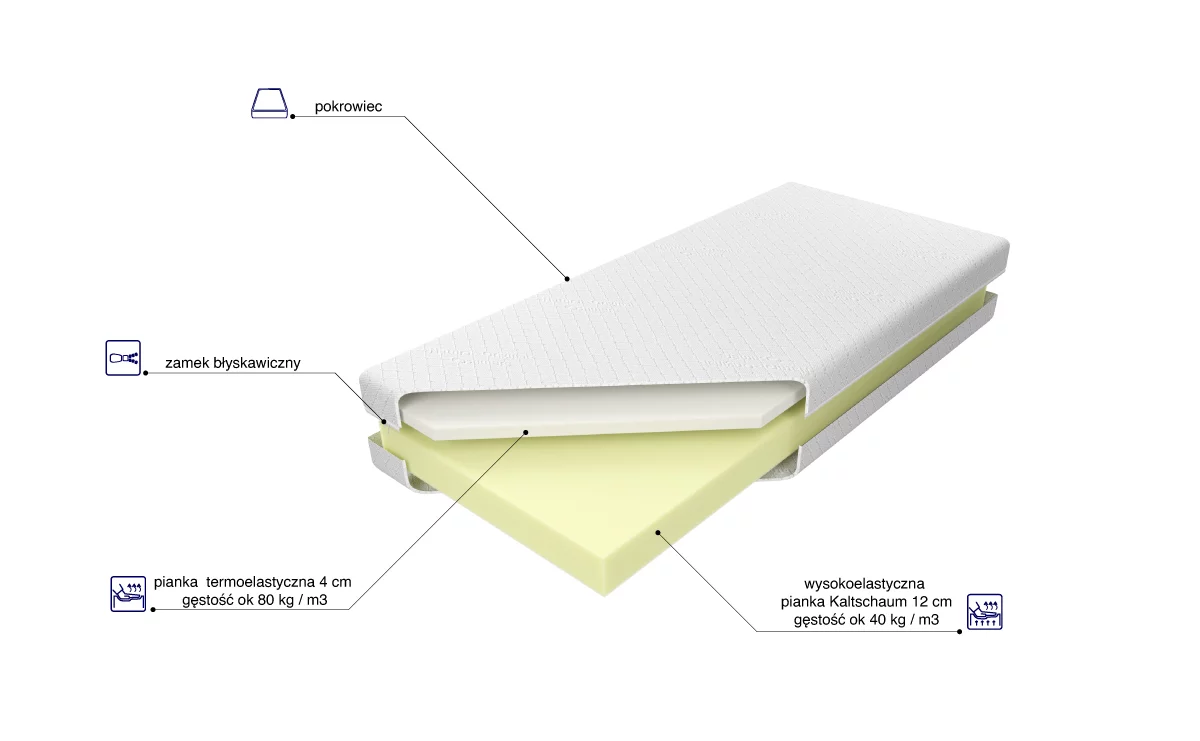 - Budowa: ok. 6 cm pianki termoelastycznej (VISCO) + ok. 16 cm pianki wysokoelastycznej Kaltschaum.