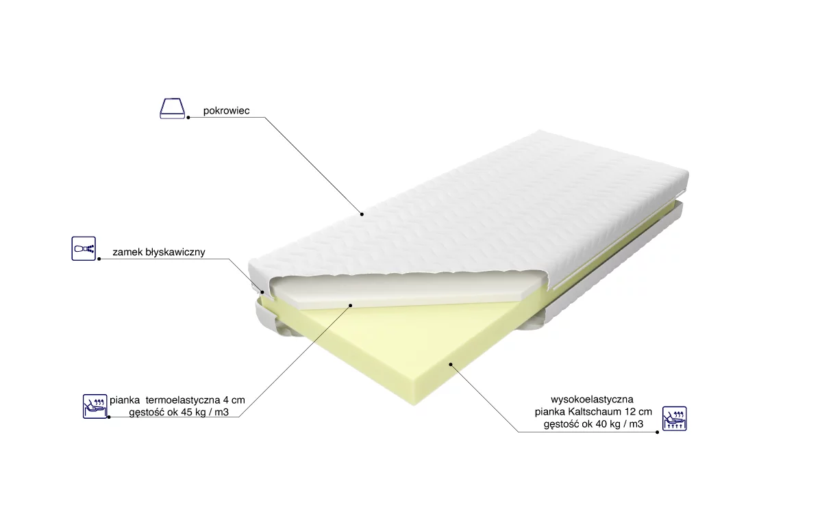 - Budowa: 4 cm pianki termoelastycznej (VISCO) + 14 cm pianki wysokoelastycznej Kaltschaum.