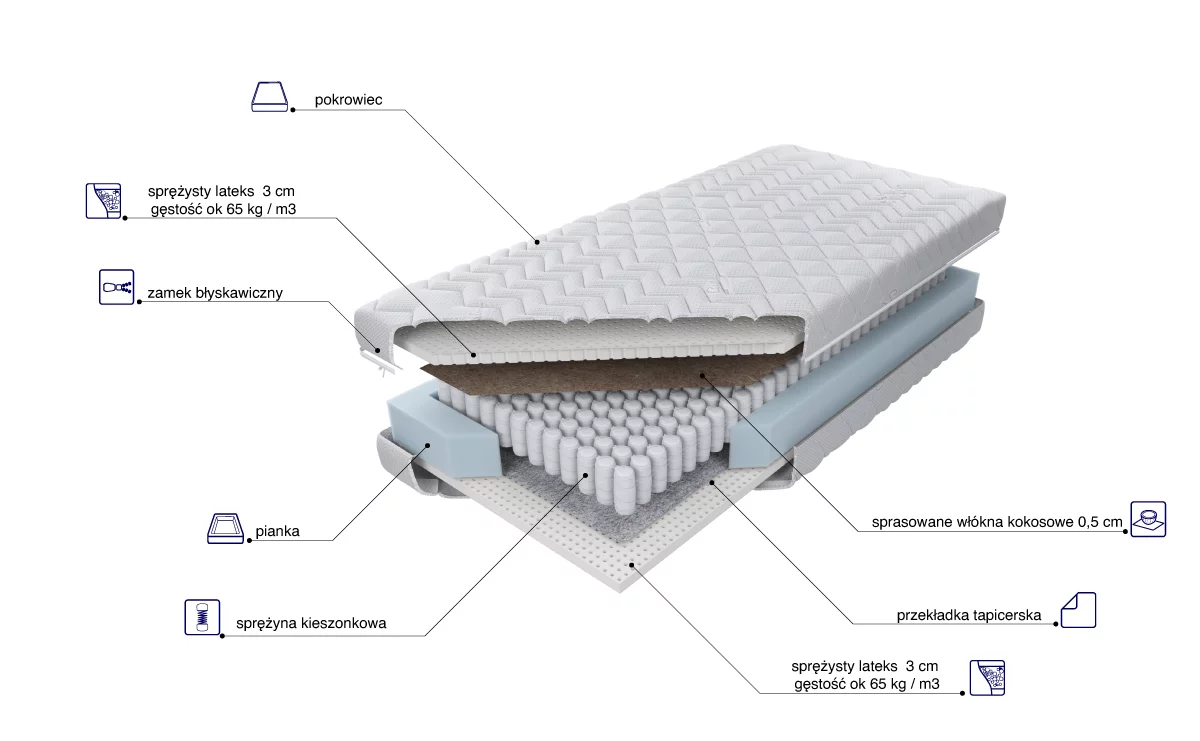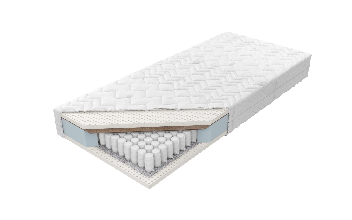 - Typ: Materac kieszeniowy, lateksowo-kokosowy, dwustronny o różnych twardościach.