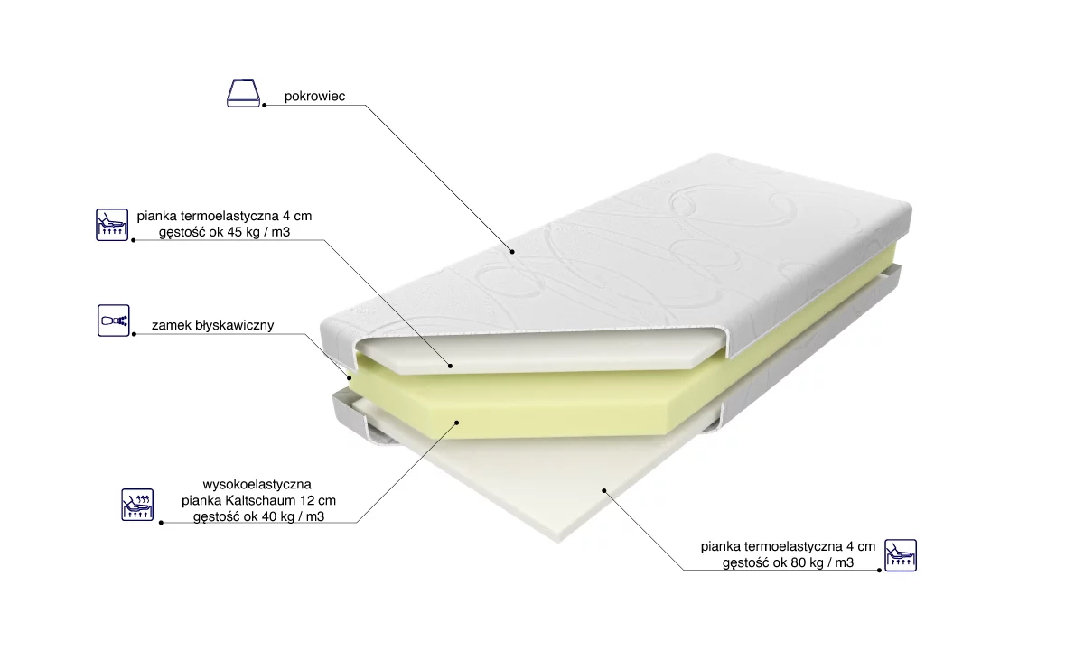 Pod warstwami komfortu znajduje się sprężysty rdzeń, który dba o prawidłowe podparcie kręgosłupa i trwałość całej konstrukcji.