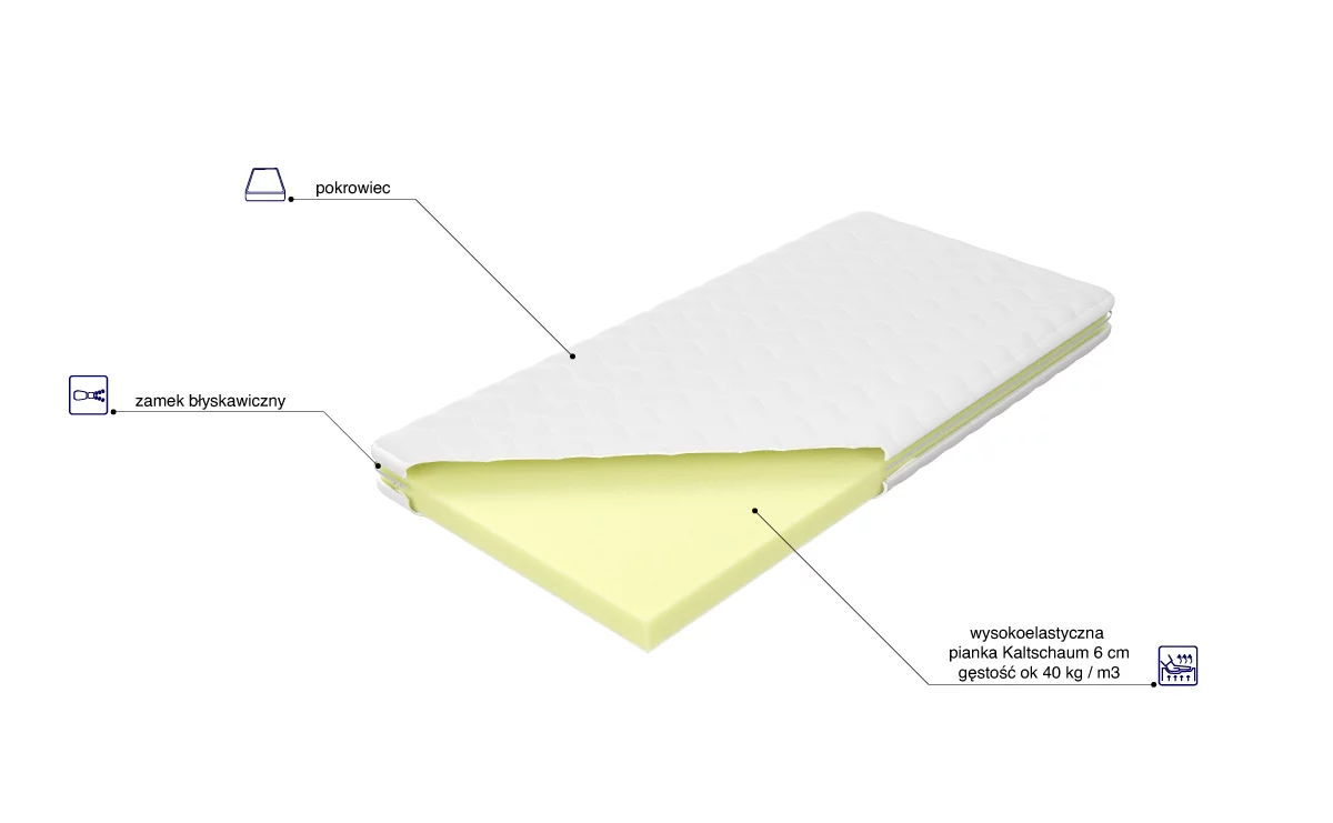 - Wkład: Jednolity blok 6 cm pianki wysokoelastycznej Kaltschaum (gęstość ~40 kg/m³).