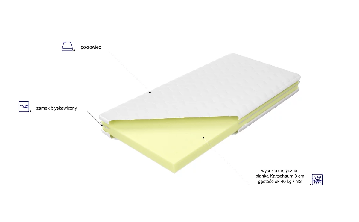 - Wkład: Jednolity blok 8 cm pianki wysokoelastycznej Kaltschaum (gęstość ~40 kg/m³).