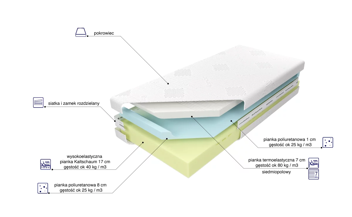 Warstwa termoelastyczna o wysokości 8 cm dopasowuje się do kształtu ciała, zapewniając wyjątkowy komfort snu. Pianka ta reaguje na temperaturę i ciężar ciała, dlatego staje się bardziej miękka w miejscu, gdzie ciało się styka z powierzchnią materaca. Dzięki temu materac zapewnia lepsze podparcie i odciążenie kręgosłupa. Pianka termoelastyczna jest również antybakteryjna i nie pozwala na rozwój roztoczy, dzięki czemu jest bezpieczna dla alergików.