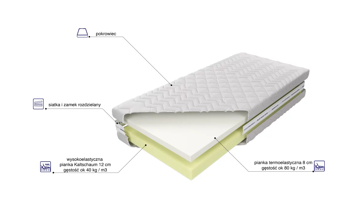 - Budowa: 8 cm pianki termoelastycznej VISCO (gęstość ~80 kg/m³) + 12 cm pianki Kaltschaum.