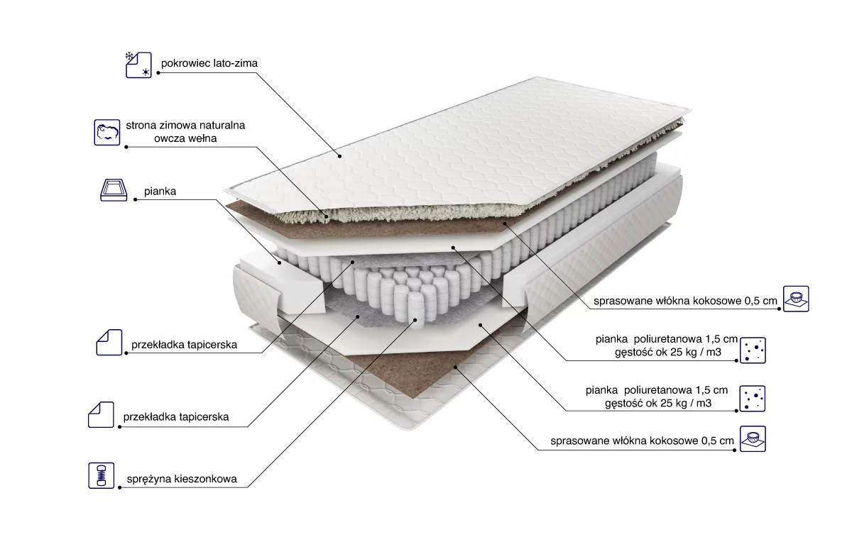 - Budowa: 0,5 cm kokos + 1,5 cm pianki PU + 12 cm sprężyn + 1,5 cm pianki PU + 0,5 cm kokos.