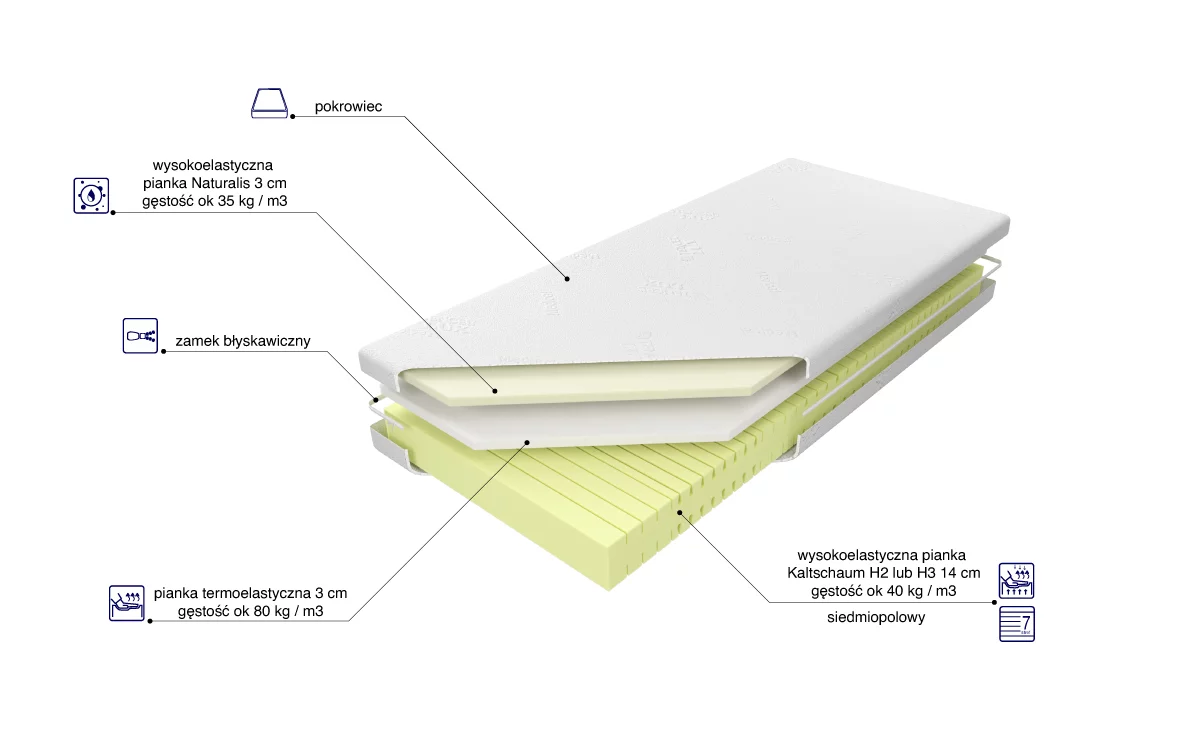 Środkowa warstwa składa się z 3 cm pianki termoelastycznej, która pod wpływem temperatury i ciężaru ciała idealnie dopasowuje się do kształtu ciała. Pianka ta zapewnia wsparcie i wygodę snu.