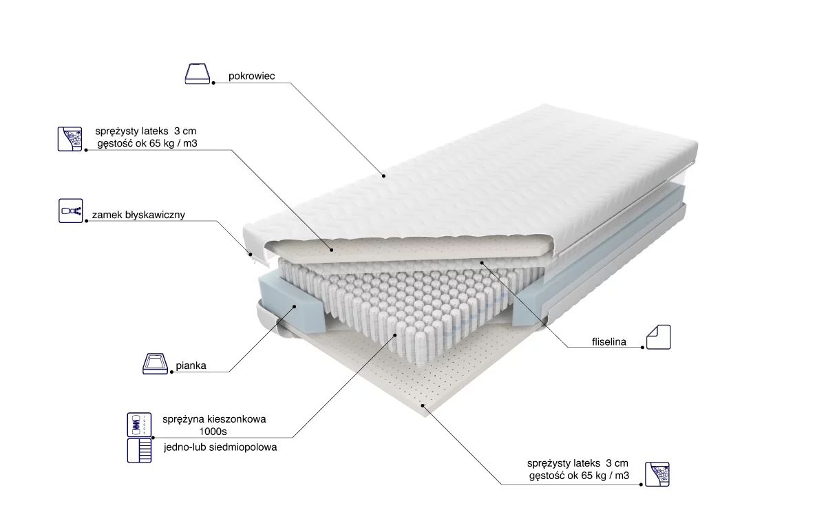 - Typ: Materac multipocket, lateksowy, dwustronny.