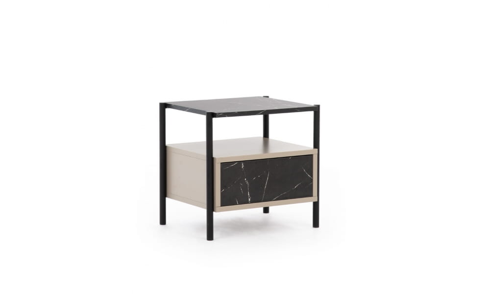 Stolik nocny Marmi to idealny wybór dla osób, które cenią sobie ponadczasową elegancję. Połączenie drewna o wzorze marmuru i czarnego metalu to duet, który nigdy nie wychodzi z mody i doskonale prezentuje się w każdej stylowej sypialni.