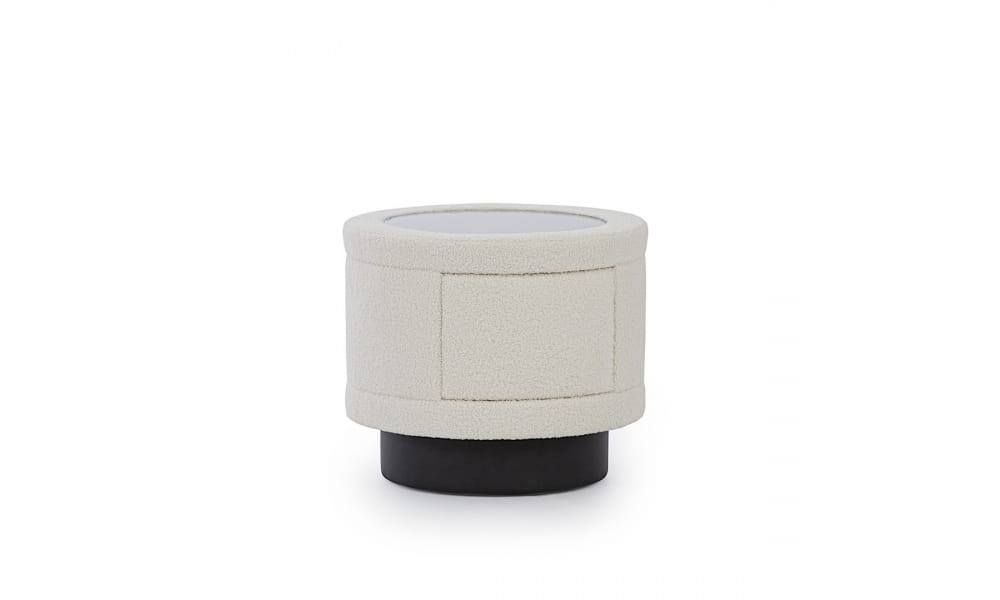 Nocny stolik tapicerowany Nello na czarnym cokole to idealny wybór dla osób, które cenią sobie połączenie nowoczesnego designu z komfortem. Jego unikalna forma, łącząca miękką tkaninę ze szklanym blatem, dodaje wnętrzu elegancji i prestiżu.
