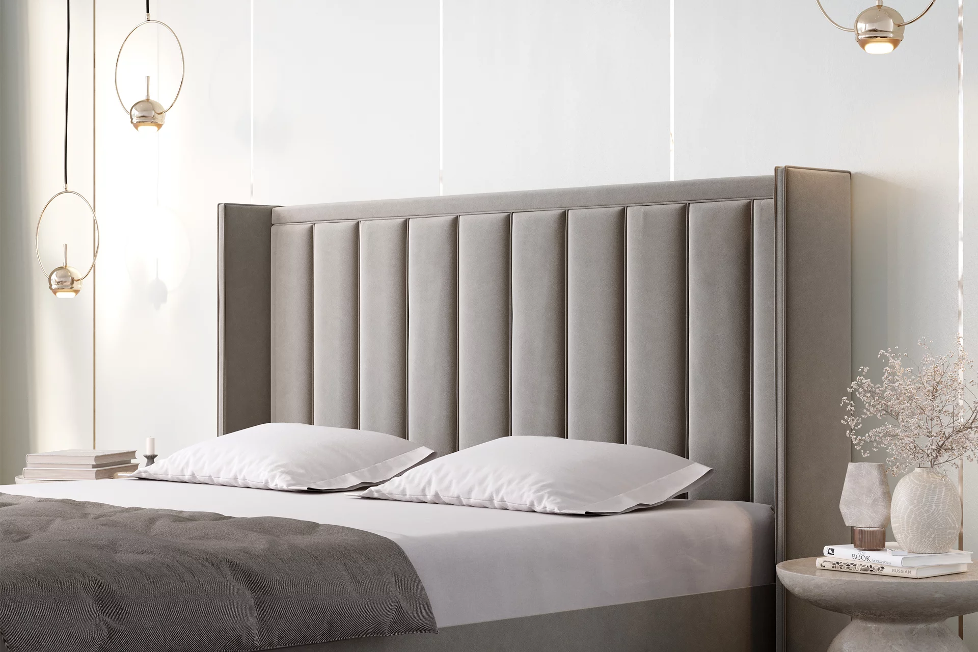 Zagłówek Z245 to propozycja dla osób ceniących sobie oryginalny design i wysoką jakość wykonania. Jego charakterystyczne pionowe przeszycia nadają mu nowoczesnego charakteru, a boczne elementy, nachodzące na korpus łóżka, tworzą spójną, elegancką całość.
